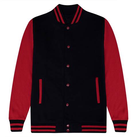 Men Baseball Jacket Brushed back Fleece Cotton Rich with Flat Knit Striped Collar, Cuffs and Bottom. Beautiful Contrast Sleeve and Button Colour Combination.