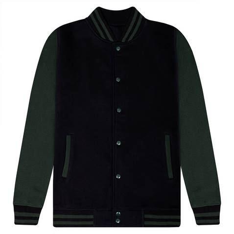 Men Baseball Jacket Brushed back Fleece Cotton Rich with Flat Knit Striped Collar, Cuffs and Bottom. Beautiful Contrast Sleeve and Button Colour Combination.